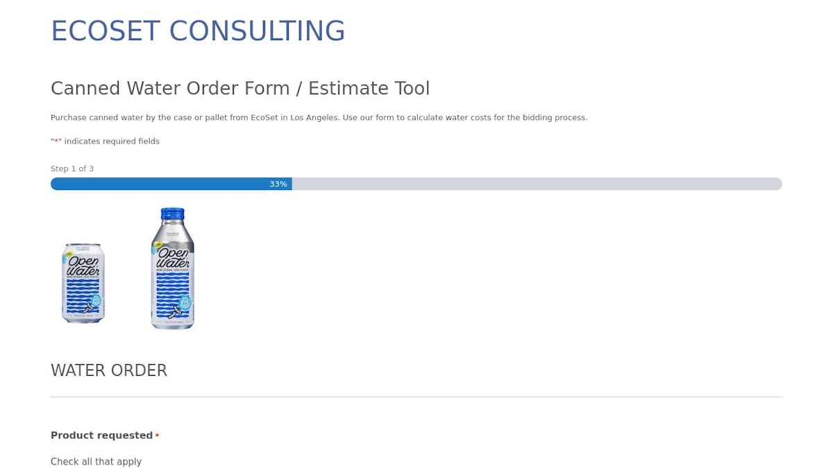 EcoSet offers a water order form that allows users to purchase canned water by the case or pallet and calculate water costs for bidding processes.