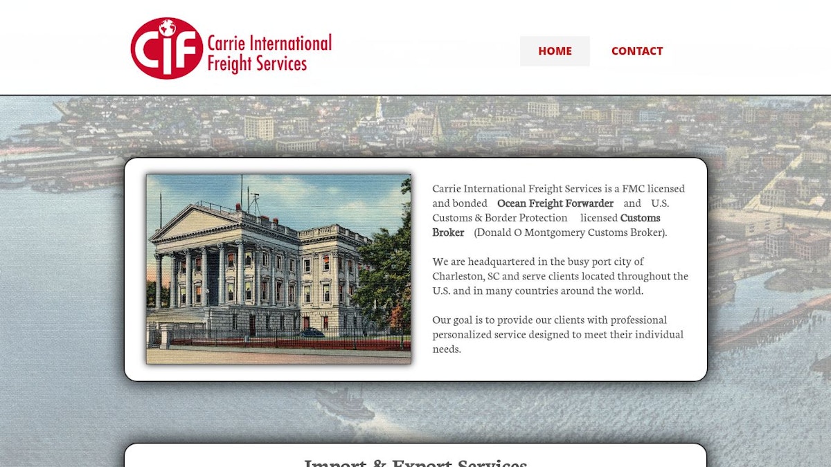 Carrie International Freight Services is a licensed Customs Broker and Freight Forwarder based in Charleston, SC, providing personalized service for various shipping needs.