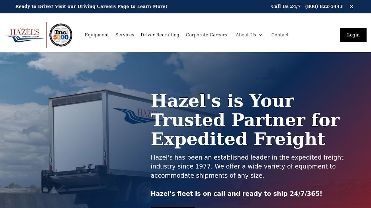 Hazel's is a leader in expedited freight services, offering 24/7/365 availability and a wide variety of equipment to accommodate shipments of any size.